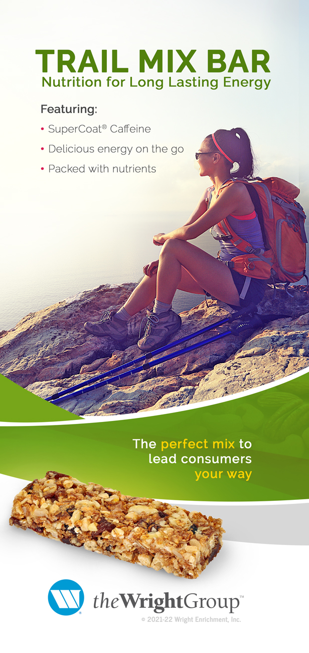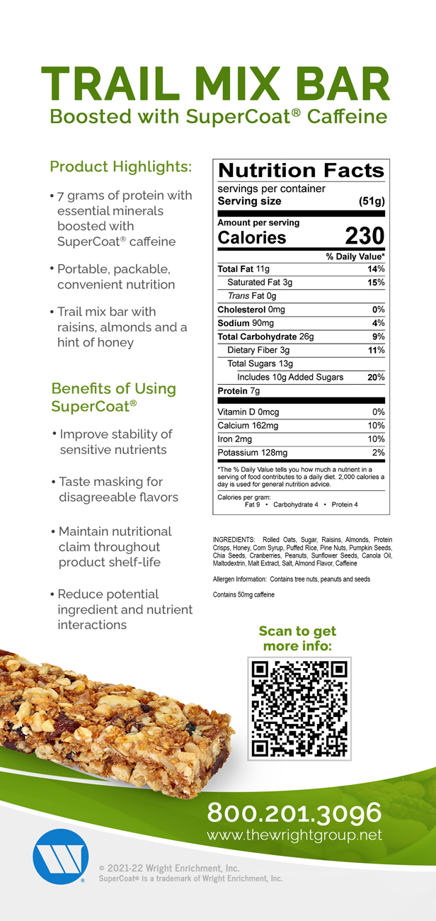 Our Trail Mix Protein Bar is a mixed nut bar with rolled oats, almonds and a hint of honey that features SuperCoat® nutrients and 50mg of caffeine for a healthy boost of energy.